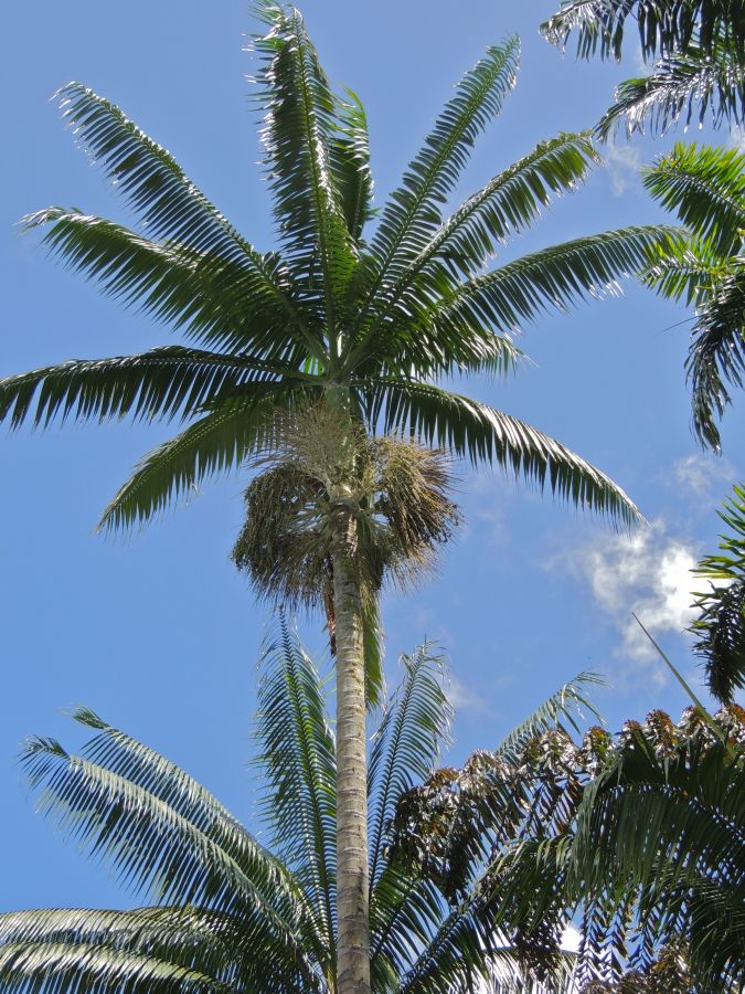 • Trunk (Stem): C. ponapense features a solitary, slender trunk that can reach heights of 15-20 meters (50-65 feet). It is greyish-brown, relatively smooth, and ringed with prominent leaf scars. A defining feature is its exceptionally long and elegant crownshaft, which is often a striking shade of olive, blue-green, or waxy white, measuring up to 2 meters (6.5 feet) in length.