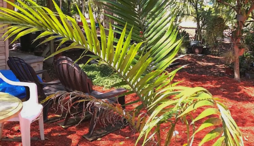 Feed every 2–3 months during active growth with a balanced slow-release palm fertilizer containing magnesium, manganese, and trace elements. These micronutrients promote vibrant crownshaft coloration and healthy frond development. Follow package directions carefully to avoid nutrient imbalances.